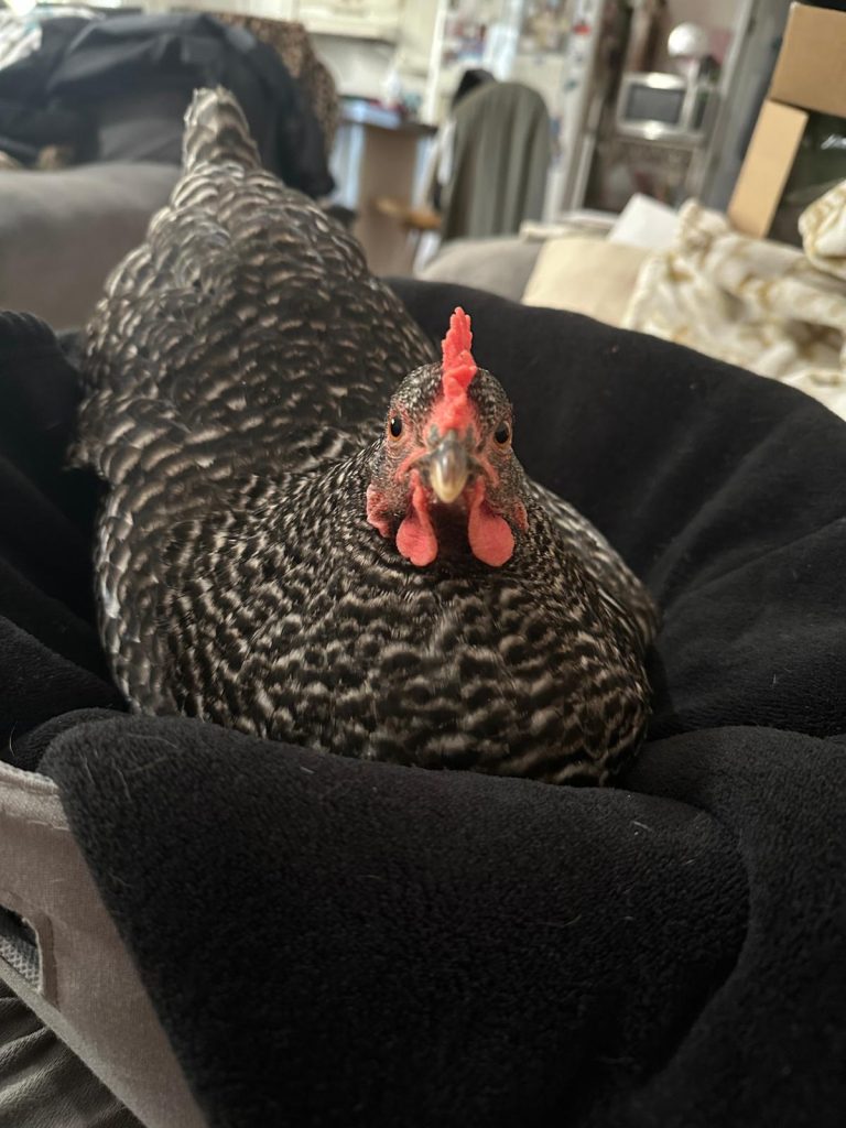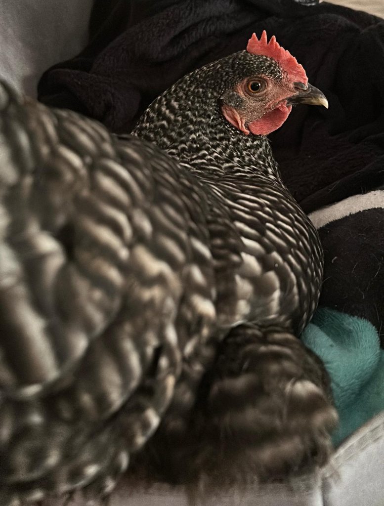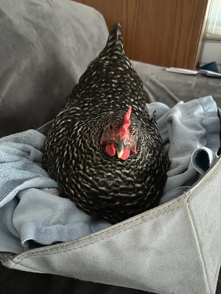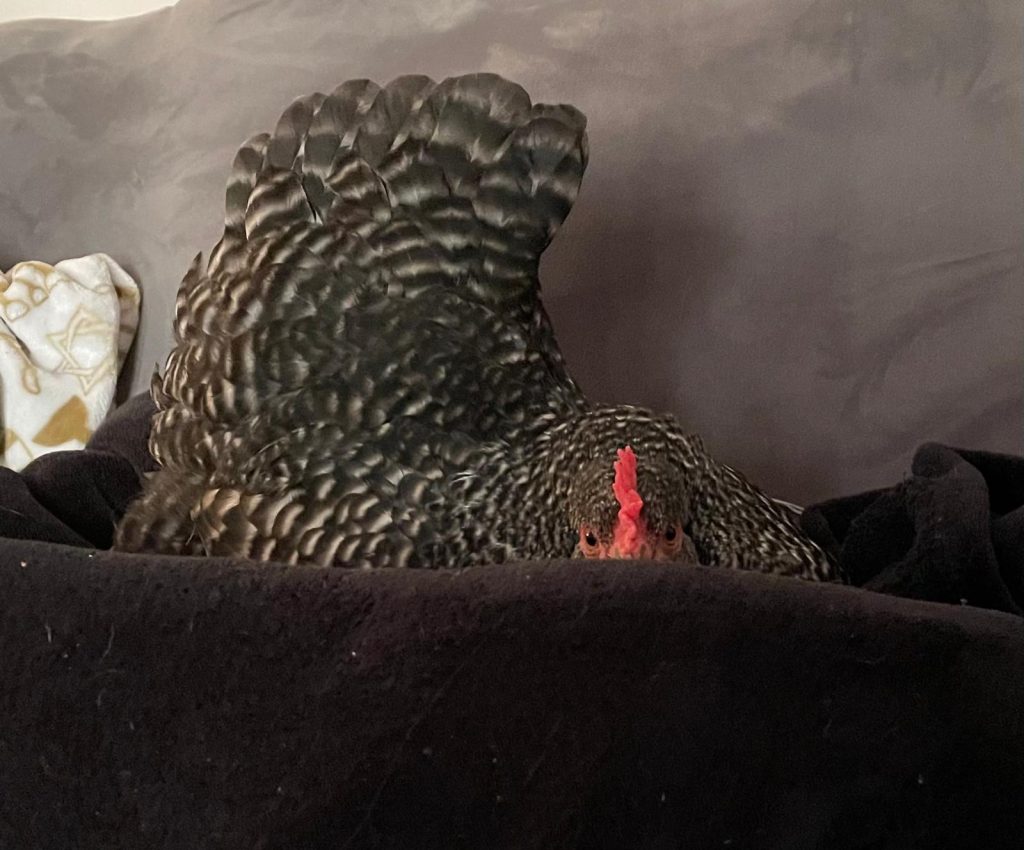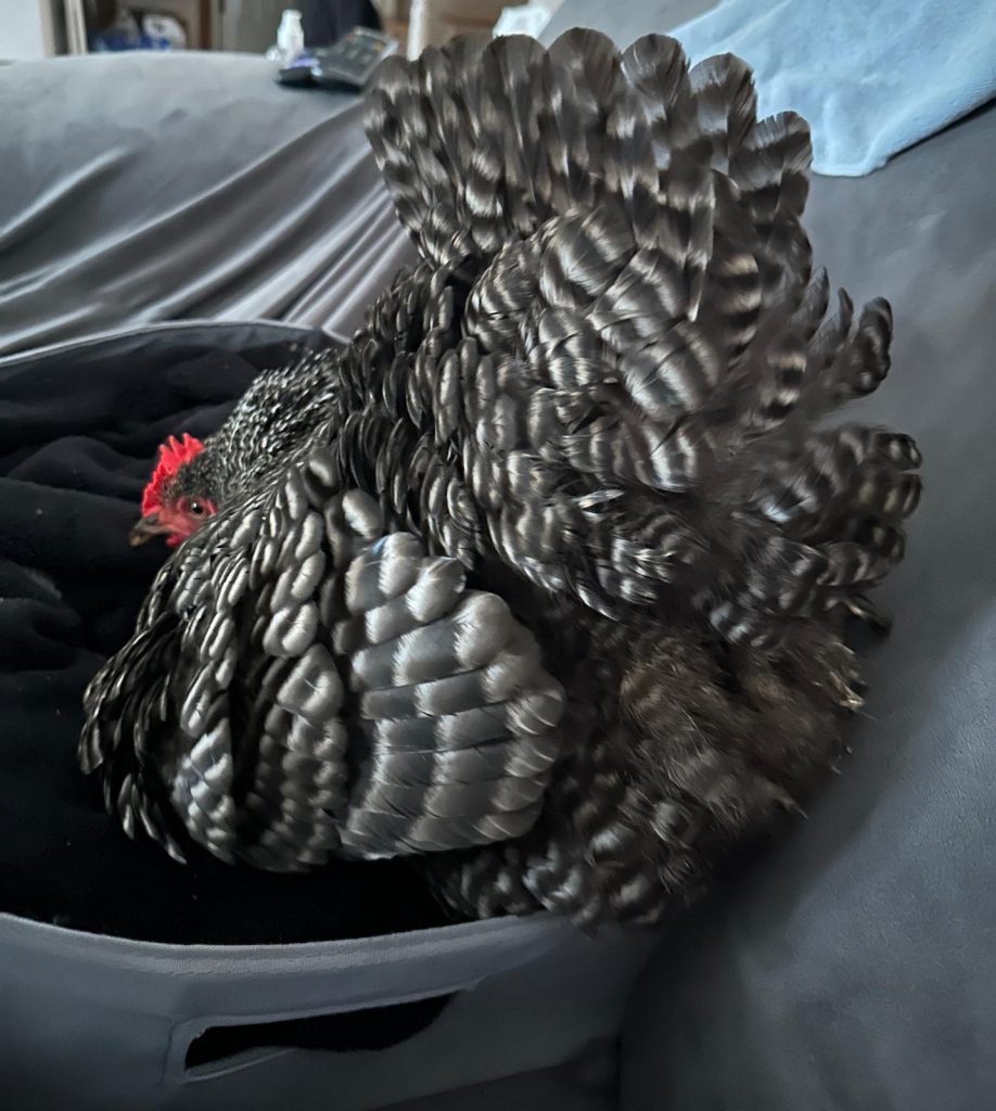 I’ve had chickens long enough that I can recognized the tells of a hen wanting to find a nest to lay an egg. Pecky was about five months old by this time, so she was certainly old enough. Instinct told her to find a safe place, so she came to the safest place she knew – inside the house. I set up a little space for her on the couch next to me and comforted her until she settled to nest.